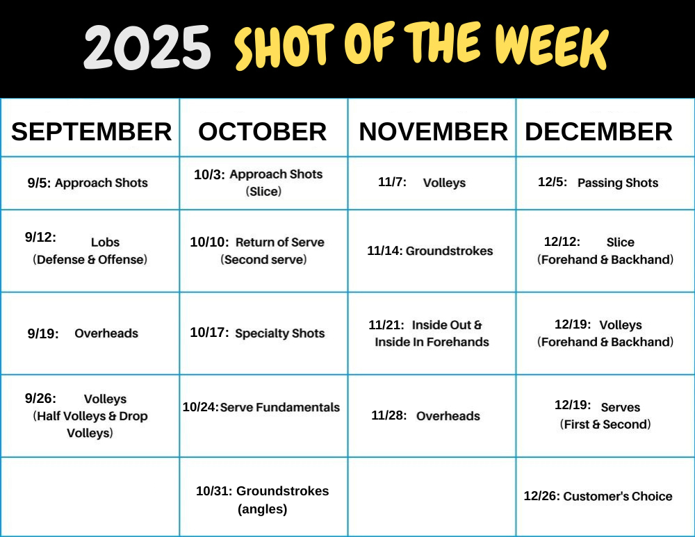 Are you looking to improve a certain area in your game? Improve your confidence on the court and master the fundamentals with our one-hour weekly clinic that focuses on one stroke each week. Make your “weakness” a strength in no time with intensive drills, expert guidance, and tailored exercises.